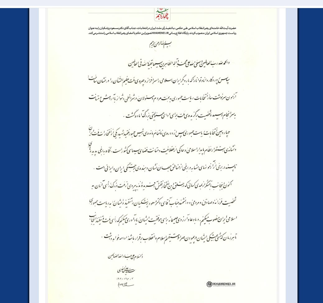 اکنون اینجانب با تشکر از همهی کسانی که در خلق این افتخار نقش آفریدهاند، به پیروی از ملت بزرگ، رأی آنان به شخصیت فرزانه، و صادق، و مردمی، و دانشمند جناب آقای دکتر مسعود پزشکیان را تنفیذ و ایشان را به ریاست جمهوری اسلامی ایران منصوب میکنم. و با دعا و آرزوی صمیمانه برای موفقیت ایشان، یادآوری میکنم که رأی ملت و تنفیذ اینجانب تا هر زمان که مشی همیشگی ایشان در پیمودن صراط مستقیم اسلام و انقلاب برقرار باشد، ادامه خواهد داشت. والسلام علی عبادالله الصالحین سید علی خامنهای ۷/مرداد/۱۴۰٣